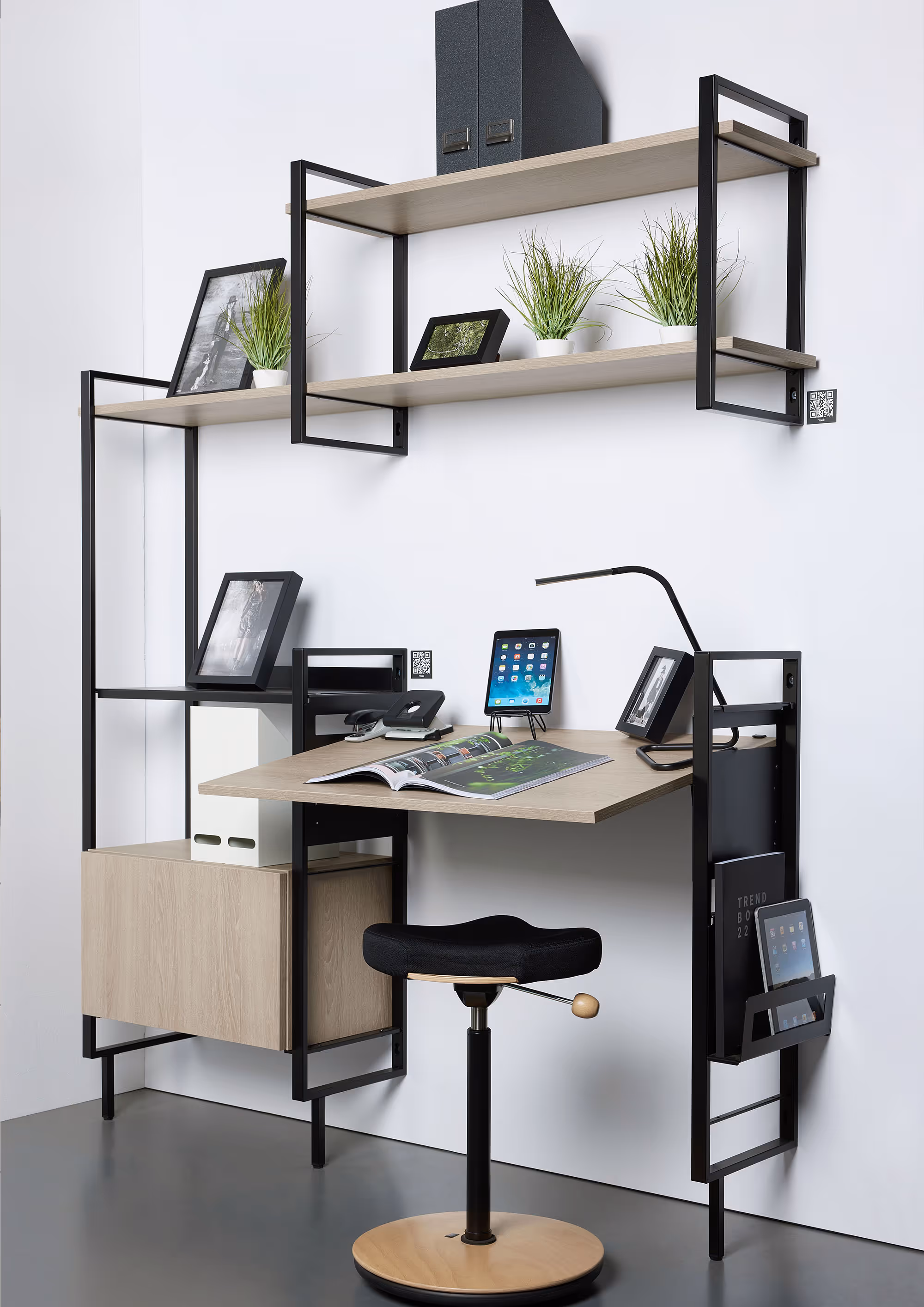 All functional elements of the YouK system can be easily hooked into the ladders, allowing for a highly adaptable and convertible shelving solution.